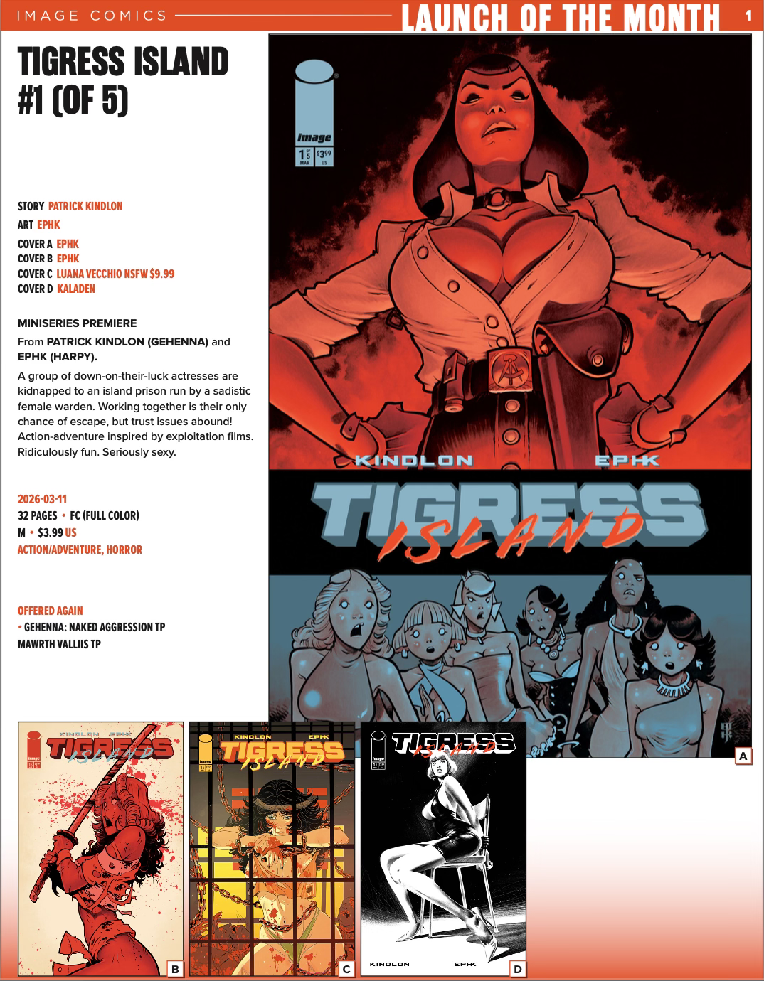 “Fan-favorite fire-starter Patrick Kindlon (Gehenna, Stringer) joins forces with artistic wild-man EPHK (Harpy) to unleash a down-and-dirty, bare-knuckled blast of pulp mayhem in Tigress Island. This five-issue fever dream will hit the racks in March 2026 from Image Comics.